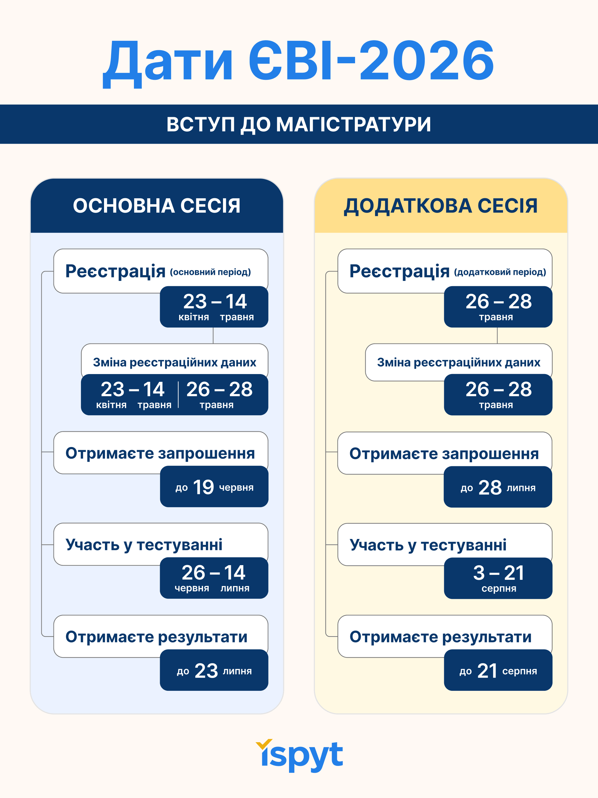 У 2026 році буде два періоди реєстрації на ЄВІ:• Основний етап — з 23 квітня до 14 травня;• Додатковий етап — 26–28 травня (для тих, хто не встиг зареєструватися під час основної реєстрації та бажає складати іспит у додаткову сесію).